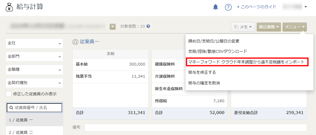 「マネーフォワード クラウド年末調整」から年調過不足税額を取り込む方法