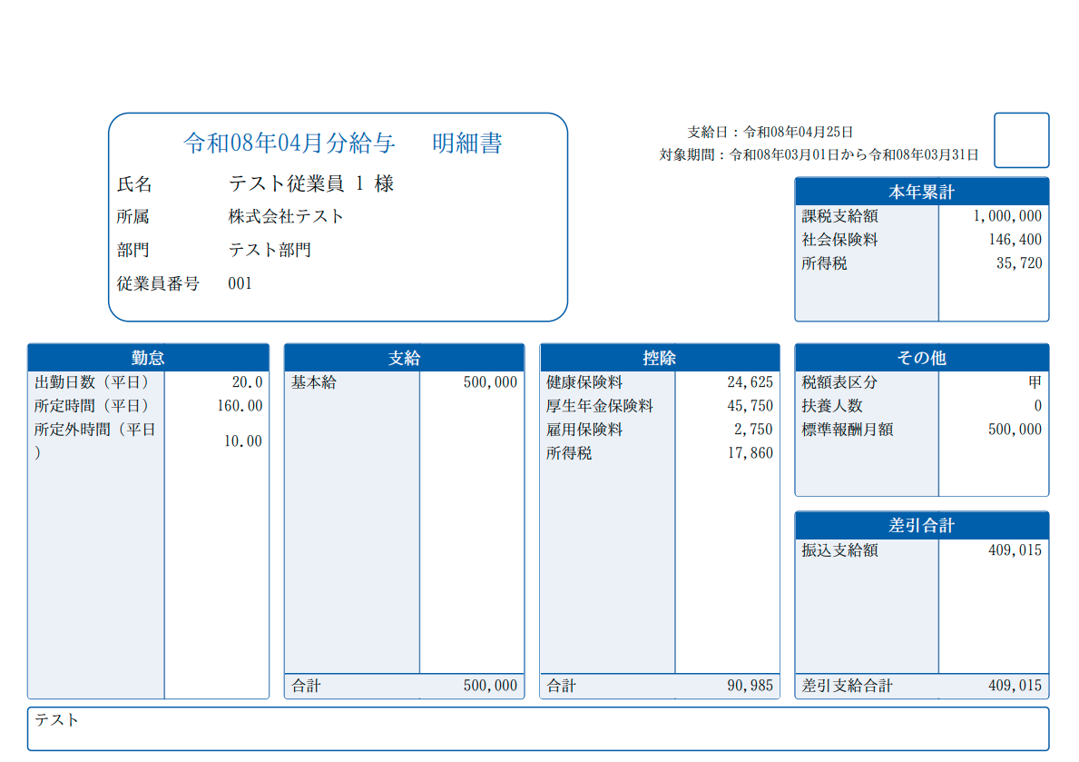 給与明細についてはタイトルを「〇〇月分 給与明細書」とし、従業員用ホーム画面や賞与明細書と表記を合わせます。