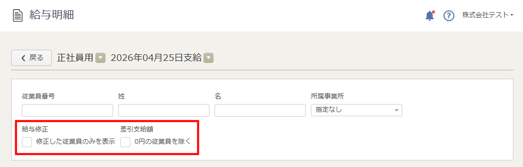給与修正の有無や、差引支給額が0円の従業員を検索するためのフィルタが追加されます。