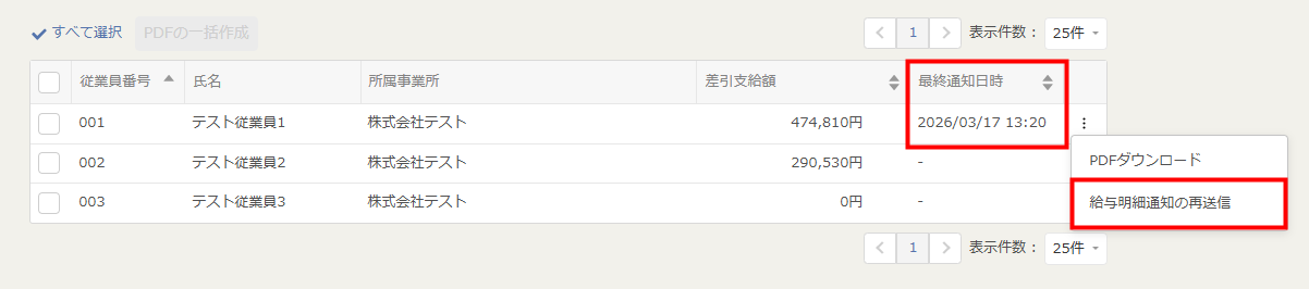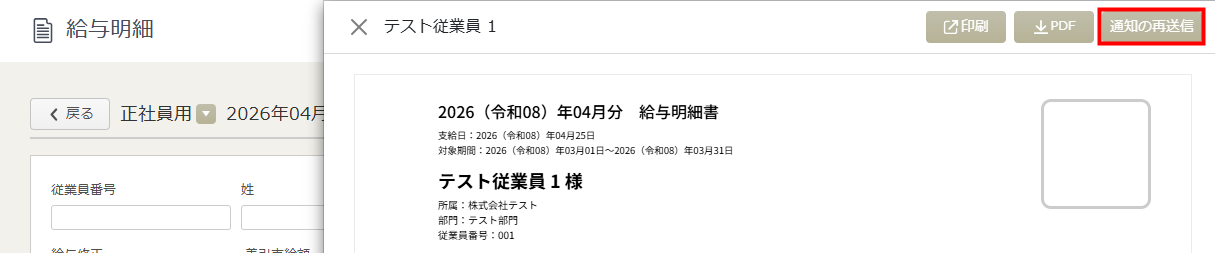 従業員の一覧や明細のプレビュー画面から、従業員ごとに通知メールの再送信が可能になります。