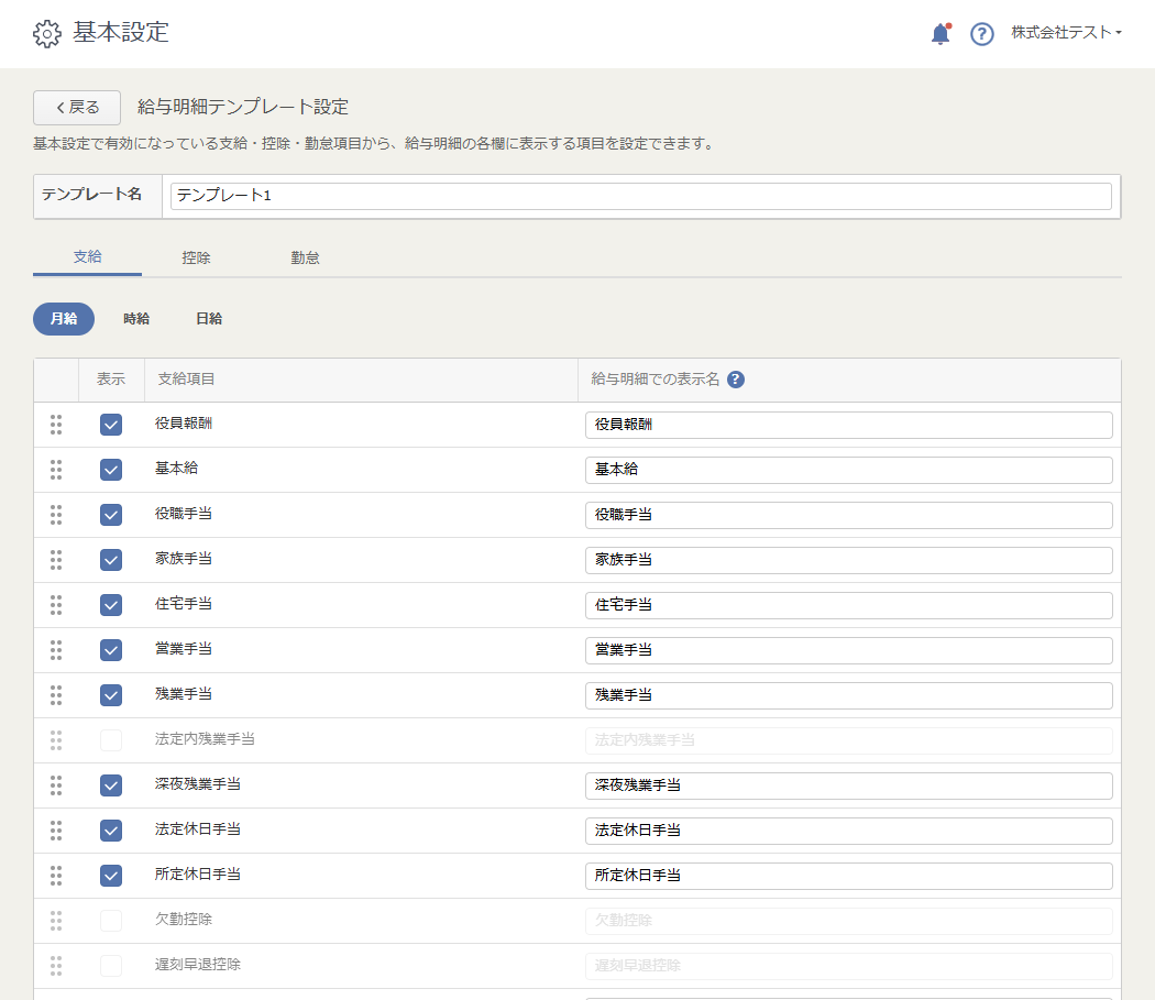 「明細」画面では、給与計算に使用する支給・控除・勤怠項目ごとに、明細への表示有無や「表示名」を設定し、「給与明細テンプレート」として保存できるようになります。