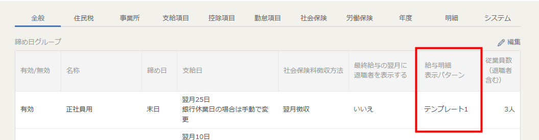 作成した「給与明細テンプレート」は、締め日グループごとに使用するテンプレートを設定できます。