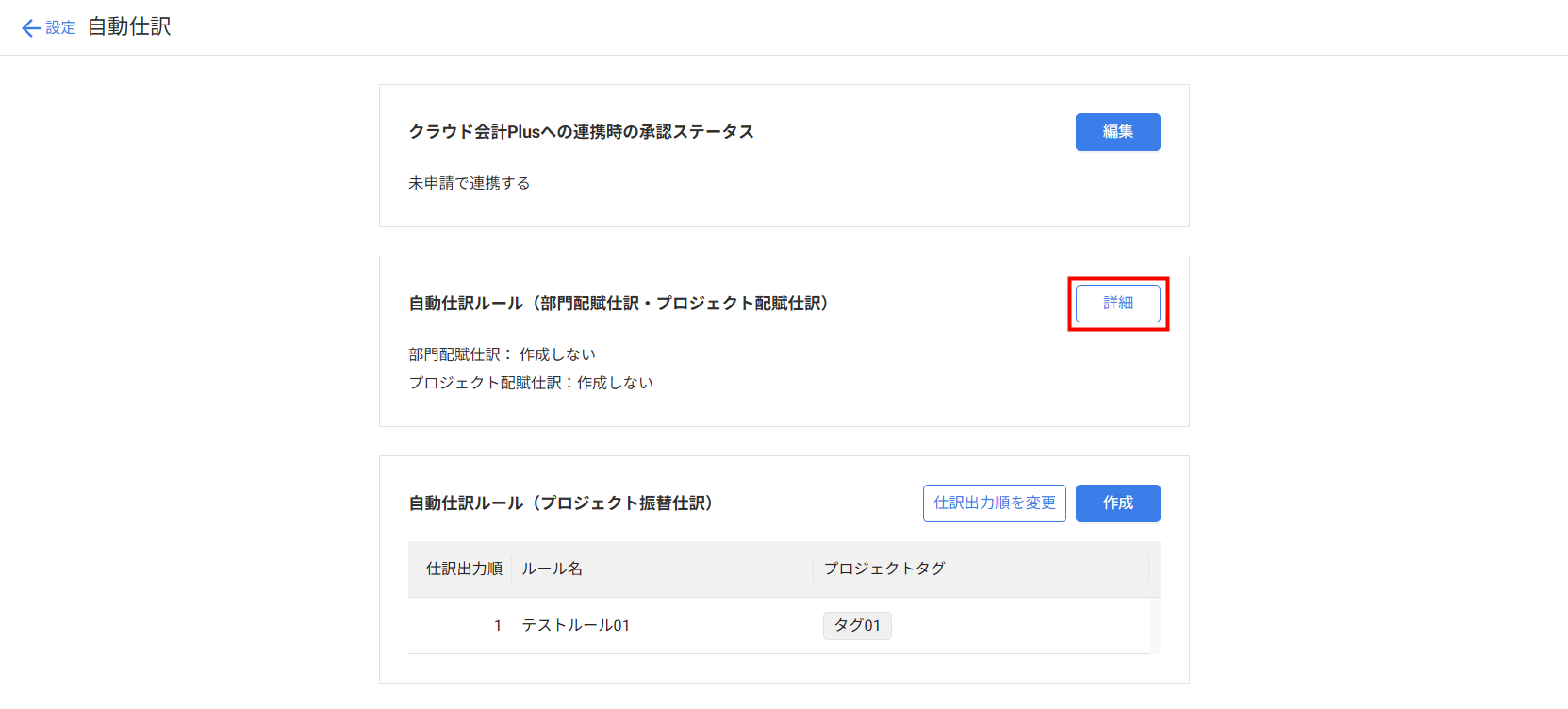 1. 自動仕訳」画面で「自動仕訳ルール(部門配賦仕訳・プロジェクト配賦仕訳)」の「詳細」をクリックします。