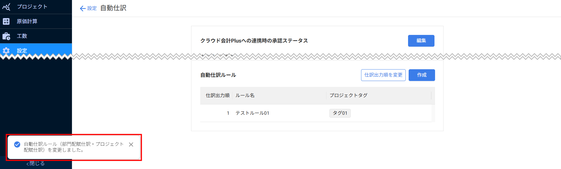 5. 画面左下に「自動仕訳ルール(部門配賦仕訳・プロジェクト配賦仕訳)を変更しました。」というメッセージが表示されたことを確認します。