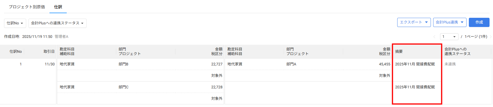 作成された仕訳の「摘要」を確認すると、「2025年11月 間接費配賦」という文字列が表示されています。