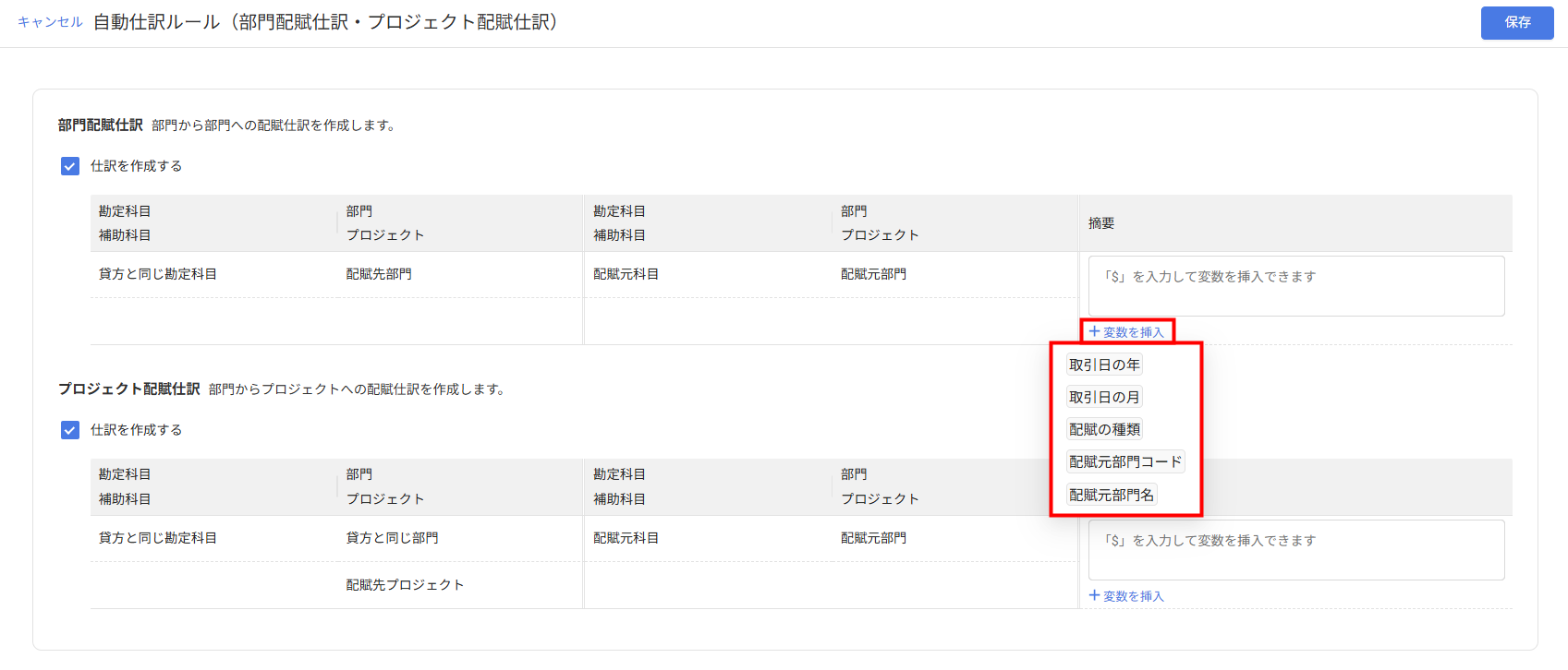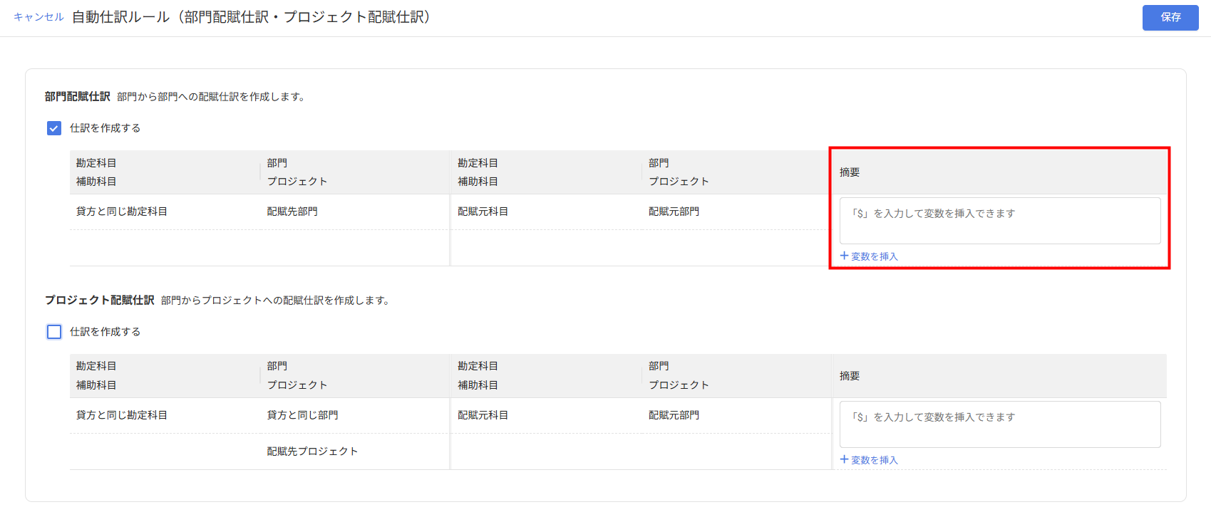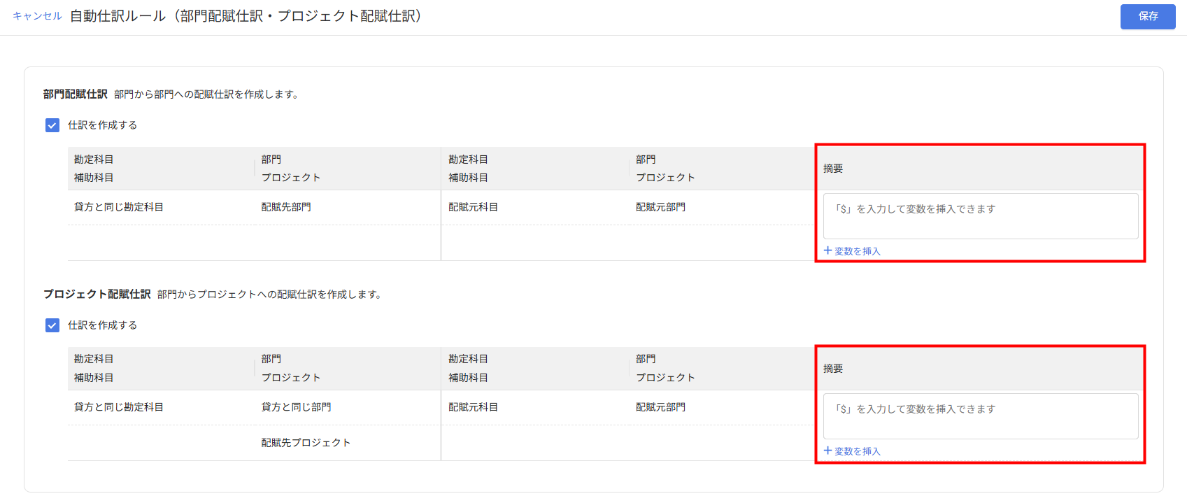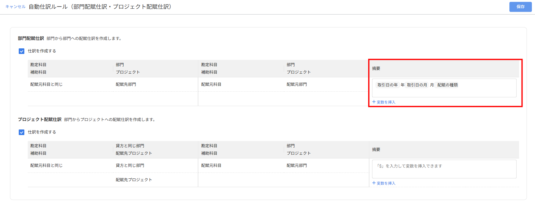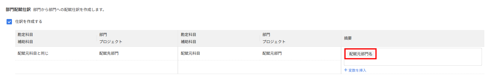 「自動仕訳ルール(部門配賦仕訳・プロジェクト配賦仕訳)」では、作成する仕訳の摘要を自由に設定できます。