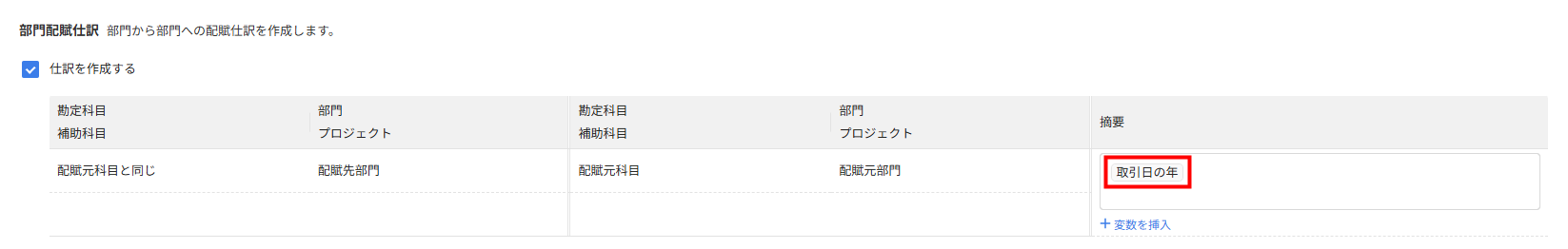 • 変数:「取引日の年」「取引日の月」「配賦の種類」