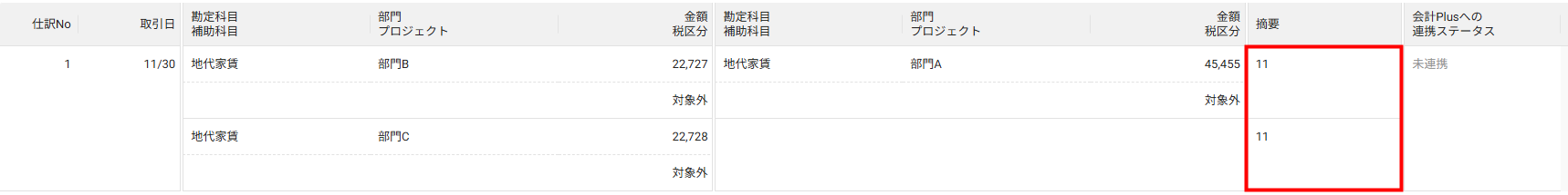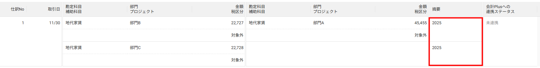 作成された仕訳の「摘要」を確認すると、配賦元部門の部門名である「部門A」のみが表示されています。