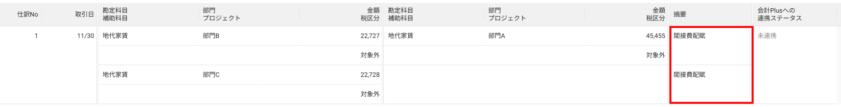 作成された仕訳の「摘要」を確認すると、「間接費配賦」のみが表示されています。