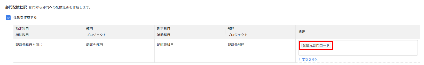 自動仕訳ルールの「摘要」に「配賦元部門コード」だけを設定した状態で仕訳を作成します。