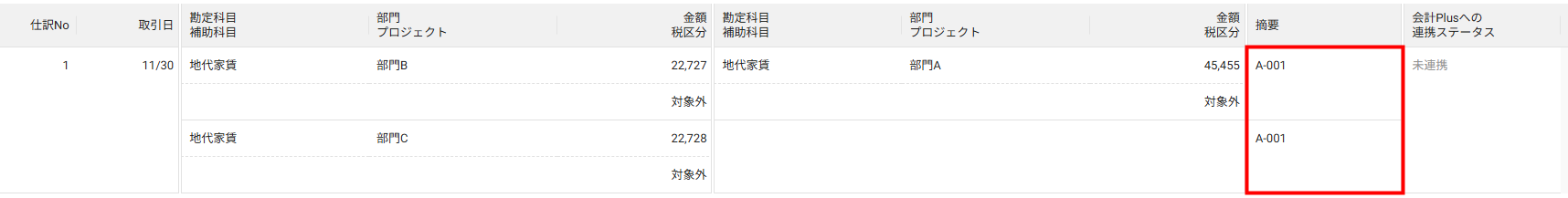 作成された仕訳の「摘要」を確認すると、配賦元部門の部門コードである「A-001」のみが表示されています。