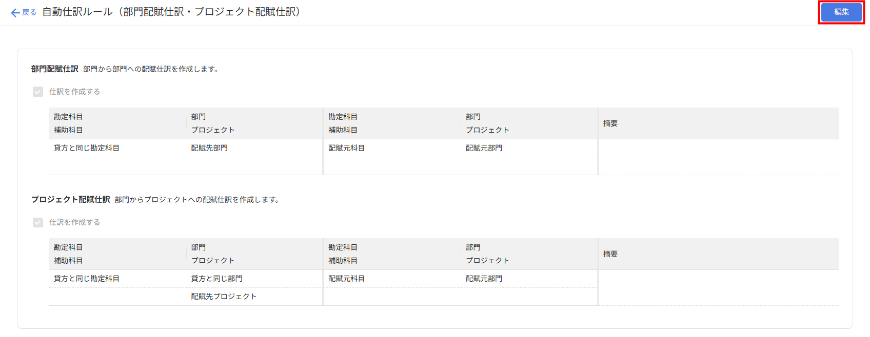 2. 「自動仕訳ルール(部門配賦仕訳・プロジェクト配賦仕訳)」画面右上の「編集」をクリックします。