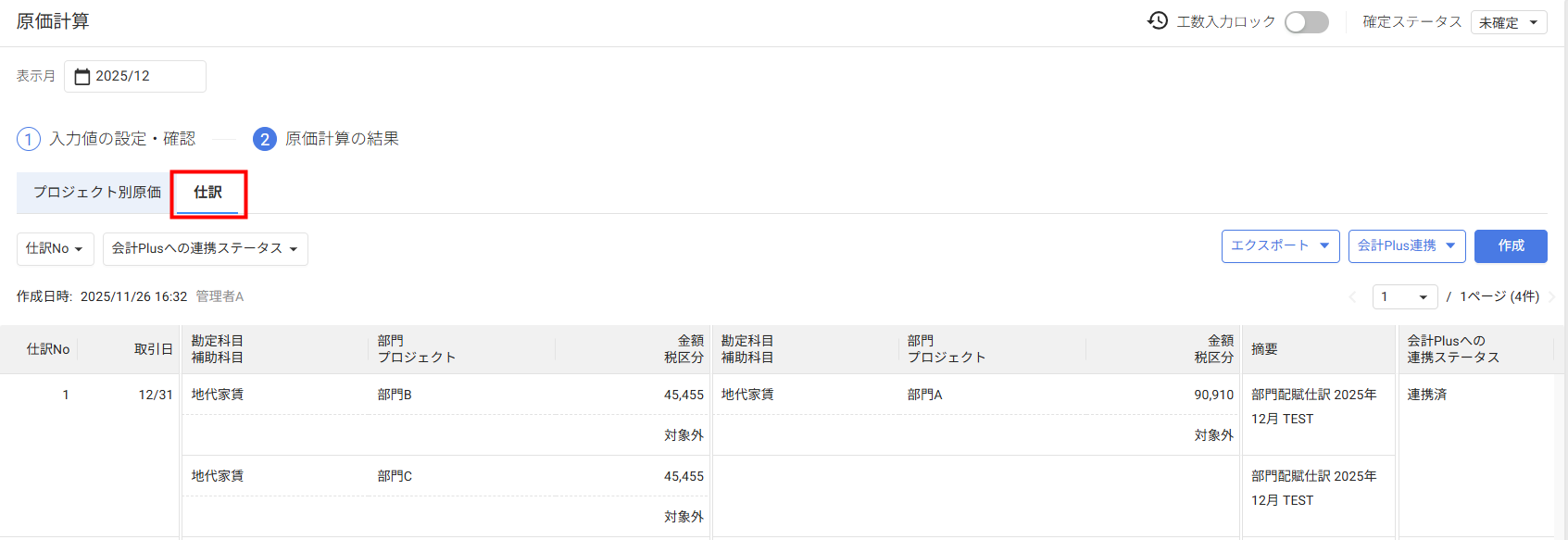 部門配賦仕訳・プロジェクト配賦仕訳の自動仕訳ルールが反映した仕訳は、「原価計算」画面で確認できます。