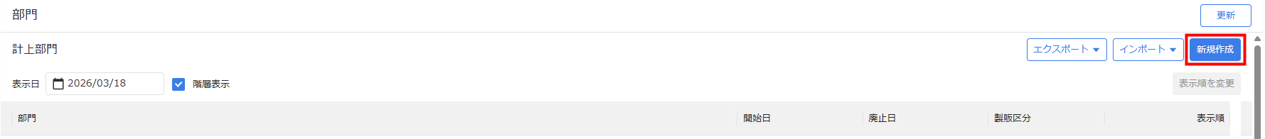 「部門」画面では、計上部門として任意の部門を作成できます。