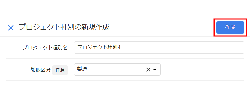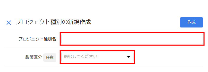 - 「プロジェクト種別の新規作成」画面で「プロジェクト種別名」を入力し、必要に応じて「製販区分」を選択します。