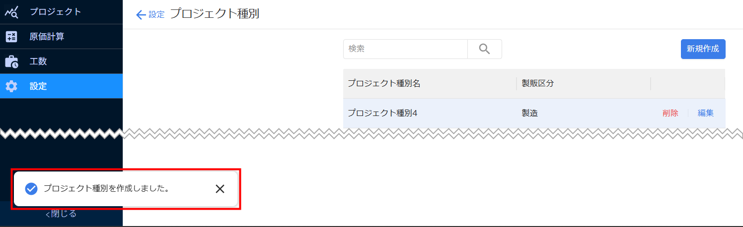 - 「プロジェクト種別を作成しました。」というメッセージが表示されたことを確認します。