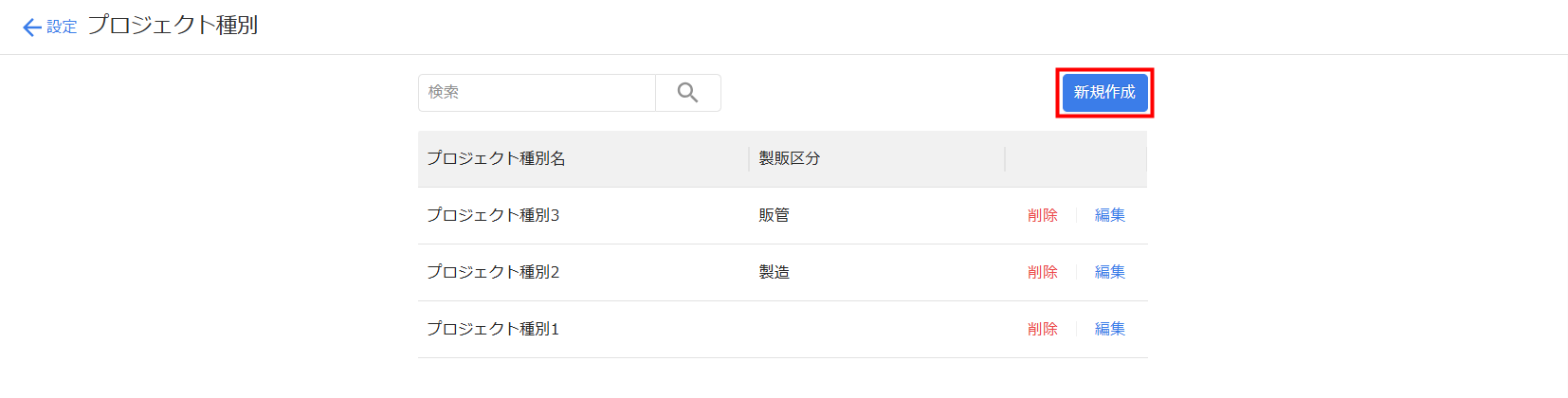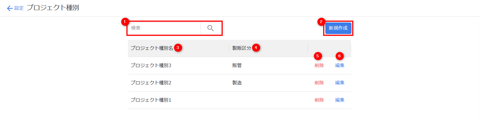 | ② | 新規作成 | クリックすると、プロジェクト種別を新規作成できます。 詳細はこちらの項をご確認ください。 |
