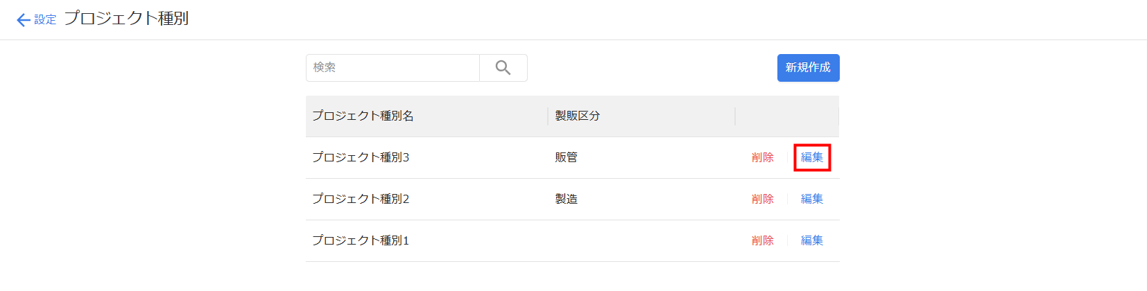 - 「プロジェクト種別」画面で編集するプロジェクト種別の「編集」をクリックします。