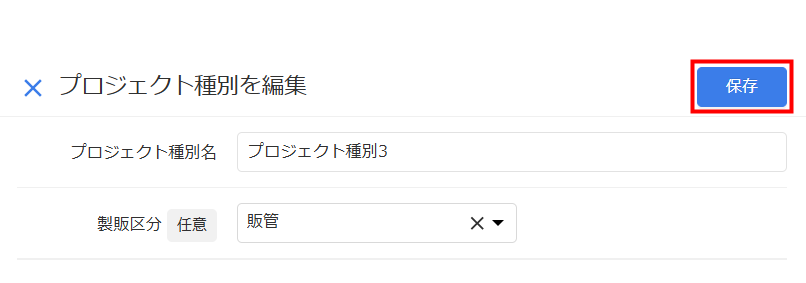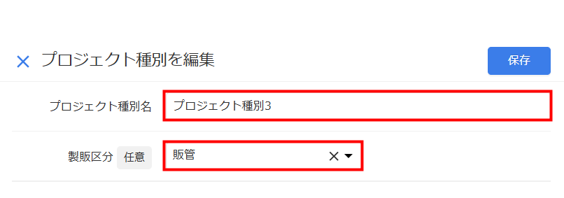 - 「プロジェクト種別を編集」画面で「プロジェクト種別名」や「製販区分」を編集します。