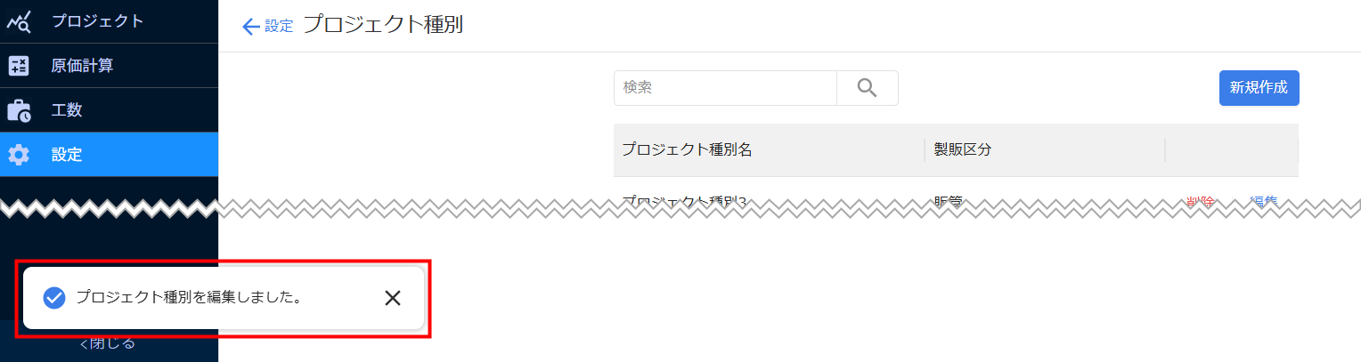 - 「プロジェクト種別を編集しました。」というメッセージが表示されたことを確認します。