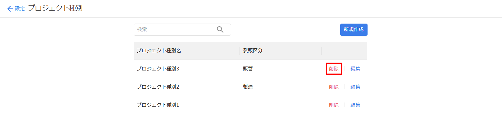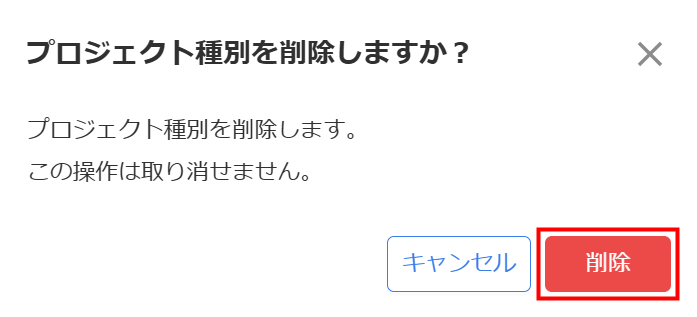- 「プロジェクト種別」画面で削除するプロジェクト種別の「削除」をクリックします。