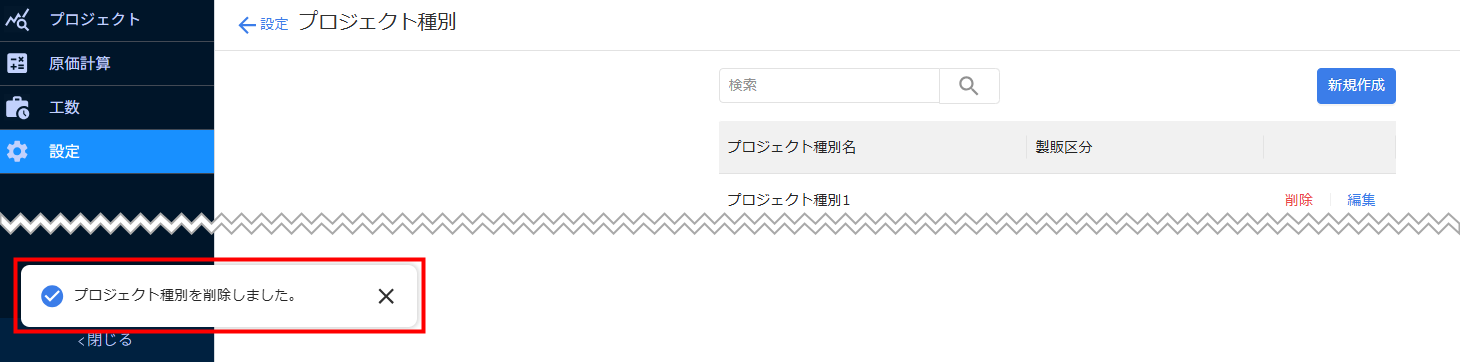 - 「プロジェクト種別を削除しました。」というメッセージが表示されたことを確認します。