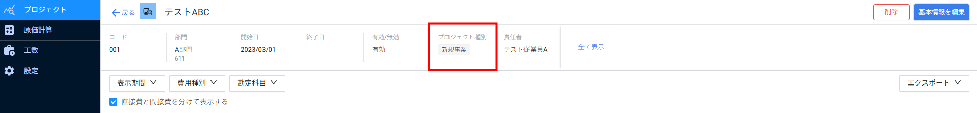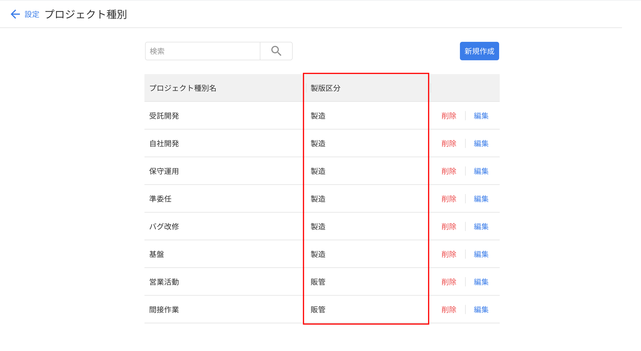 すでに存在しているプロジェクト種別では、製販区分が空欄となります。