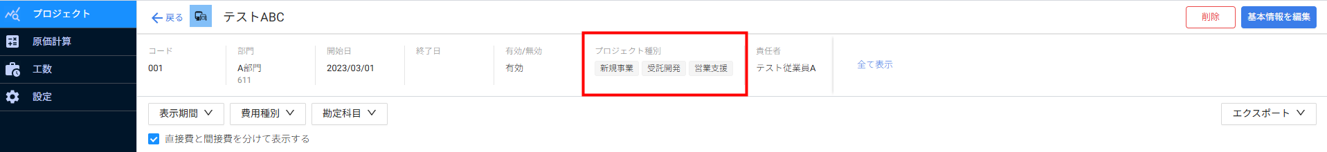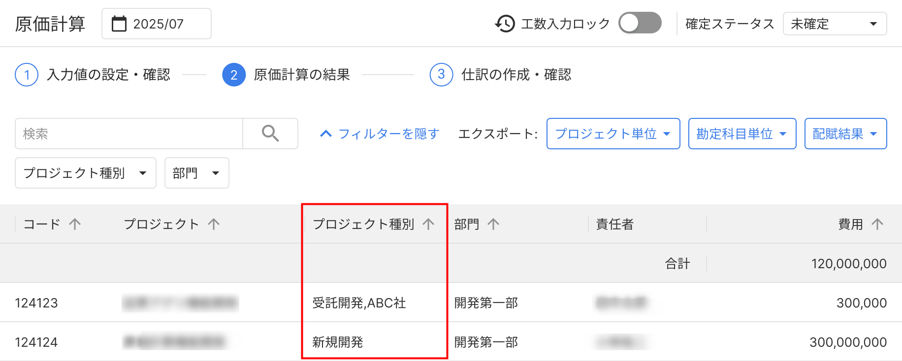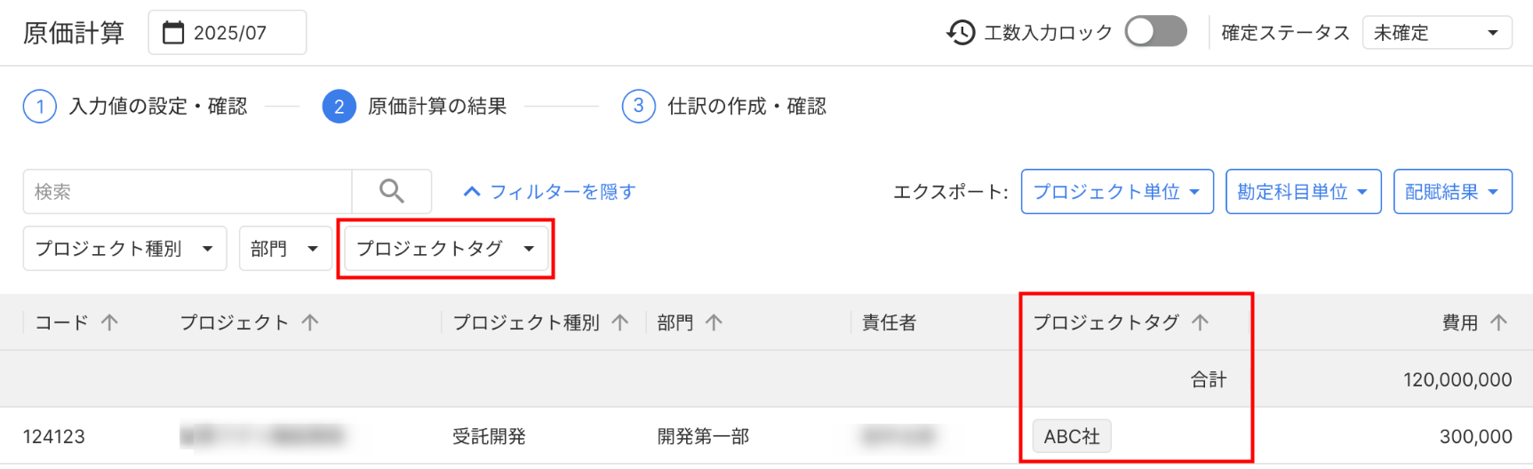 これに伴い、「原価計算」画面のテーブルとフィルターに「プロジェクトタグ」を追加します。