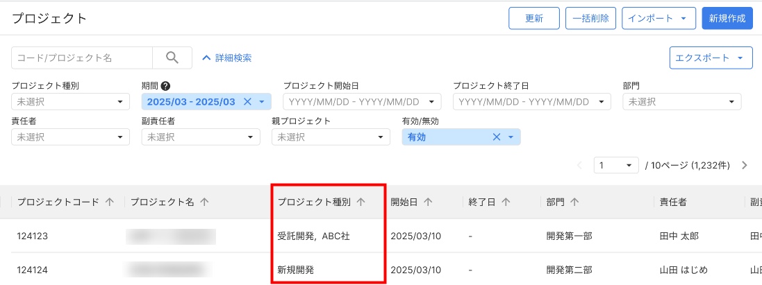 プロジェクト種別が複数付与されているプロジェクトは、「プロジェクト」画面で一番左に表示されているプロジェクト種別のみ付与された状態となります。