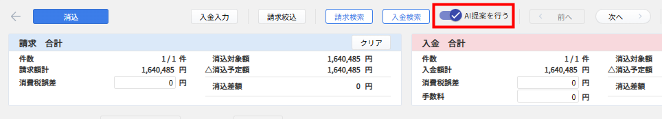 AI入金検索を利用すると、「請求 合計欄」の「消込対象額」と入金データの「入金残」が一致する入金データが表示されます。