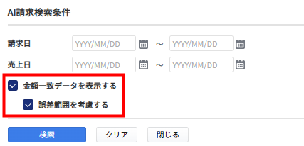 AI検索条件欄で「金額一致データを表示する」にチェックを入れて検索すると、「請求 合計欄」または「入金 合計欄」の「消込対象額」と一致するデータが候補として表示されます。