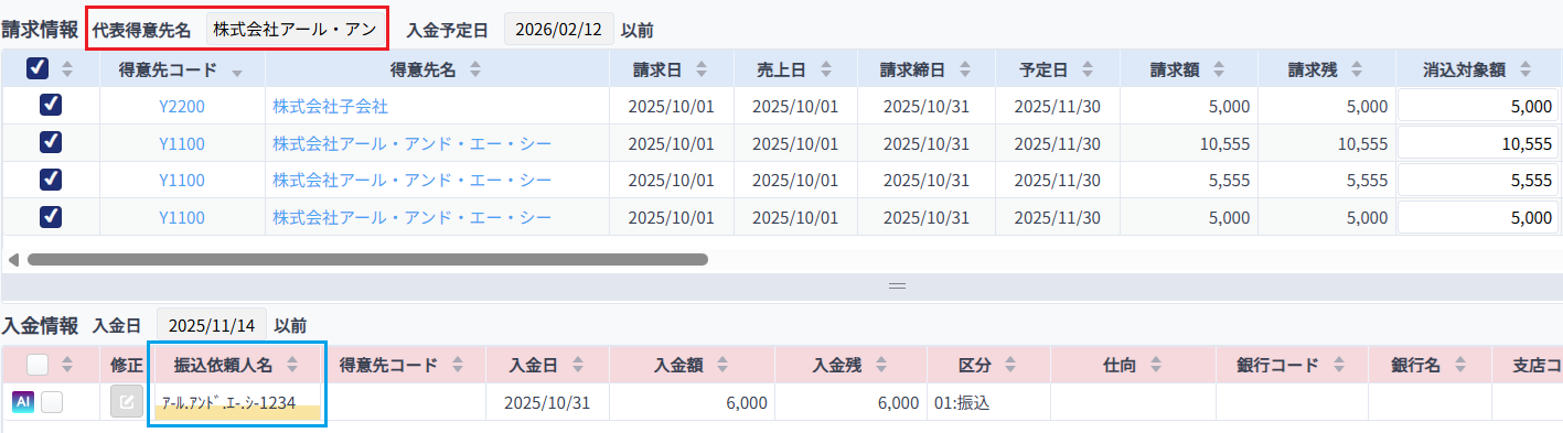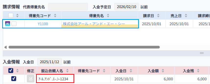 AI入金検索を利用すると、請求情報の代表得意先名に表示される「得意先カナ」と類似する「振込依頼人名」が紐づく入金データが表示されます。