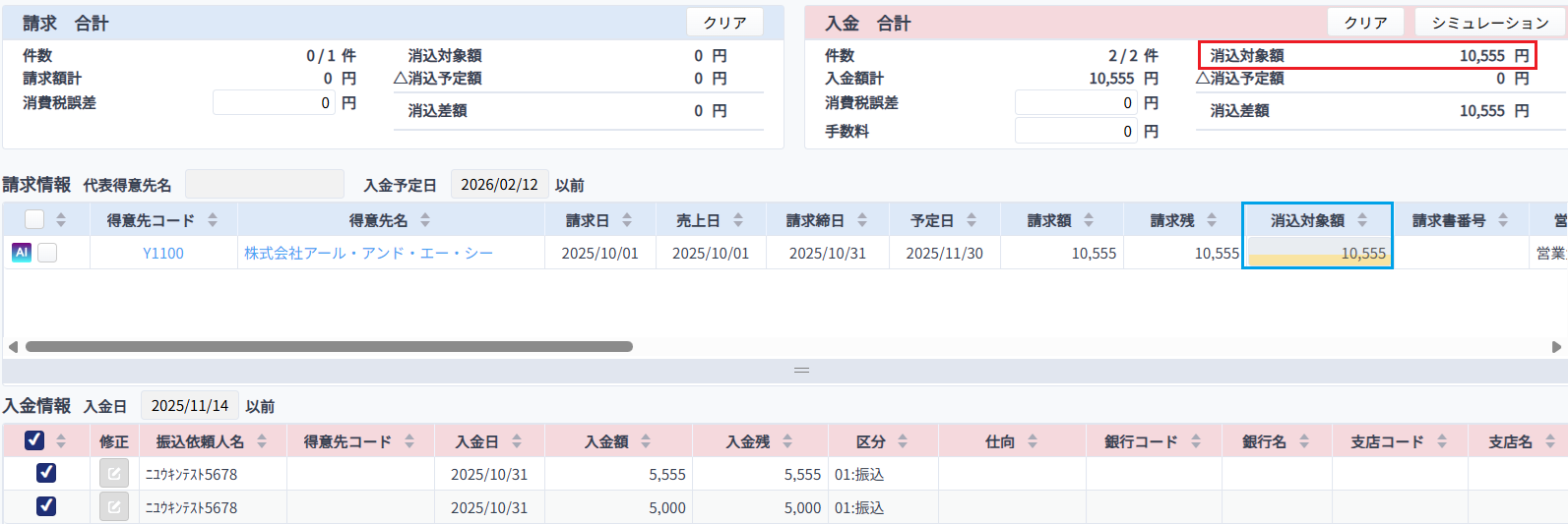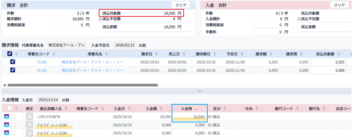 AI請求検索を利用すると、「入金 合計欄」の「消込対象額」と請求データの「消込対象額」が一致する請求データが表示されます。