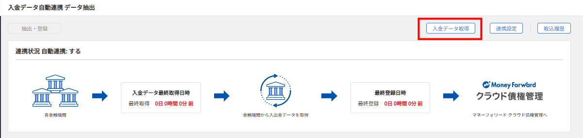 1.【入金】「入金データ自動連携 データ抽出」にて「入金データ取得」ボタンをクリックします。