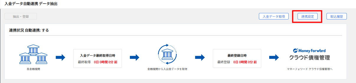 1.【入金】「入金データ自動連携 データ抽出」にて「連携設定」ボタンをクリックします。