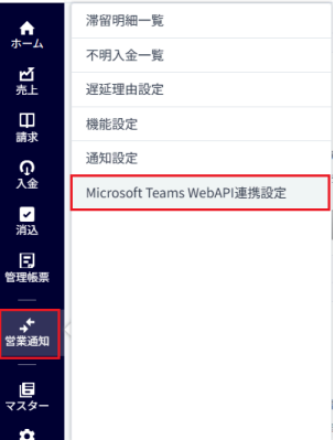 - 左メニューの「営業通知」をクリックし、「Microsoft Teams WebAPI連携設定」を選択します。
