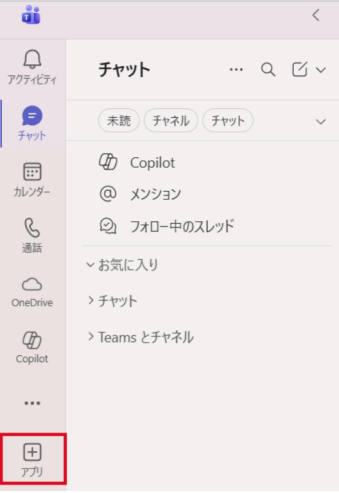 - 「Microsoft Teams」を開き、サイドバーの「アプリ」をクリックします。