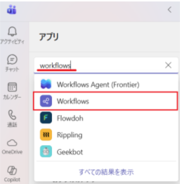 出典:Microsoft,「Microsoft Teams」(2025年11月27日) - 検索ボックスに「Workflows」と入力し、検索結果に表示された「Workflows」を選択します。