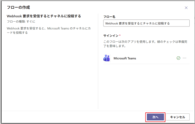 - 「フローの作成」画面で必要に応じて「フロー名」を入力し、「次へ」をクリックします。