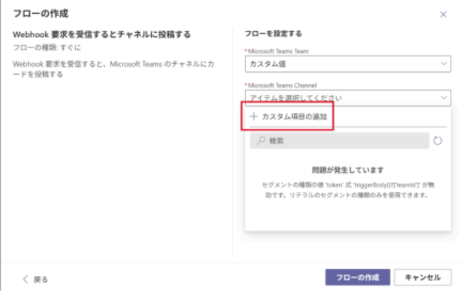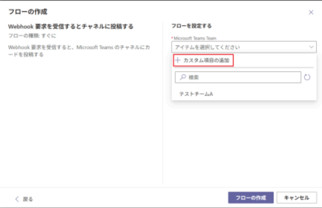 - 「フローの作成」画面で「Microsoft Teams Channel」のプルダウンをクリックし、「カスタム項目の追加」を選択します。