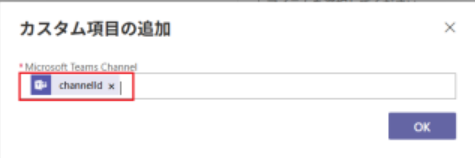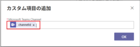 - 「カスタム項目の追加」画面の入力欄に「@{triggerBody()?[‘channelId’]}」の文字列を貼り付け、「OK」をクリックします。