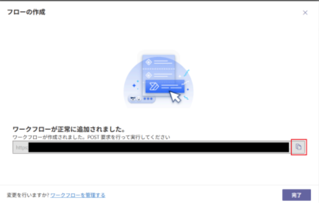 - 「フローの作成」画面に「ワークフローが正常に追加されました」と表示されたことを確認し、発行されたURLをコピーします。