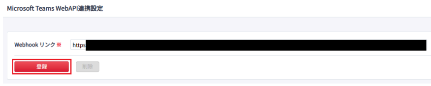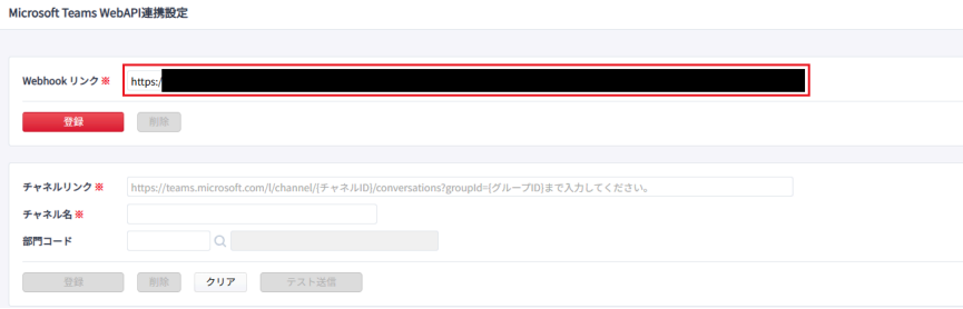 - マネーフォワード クラウド債権管理の「Microsoft Teams WebAPI連携設定」画面に戻り、「Webhook リンク」にコピーしたURLを貼り付けます。