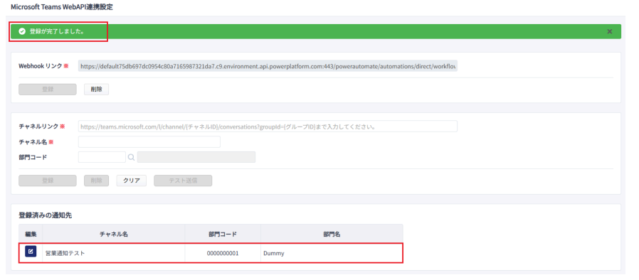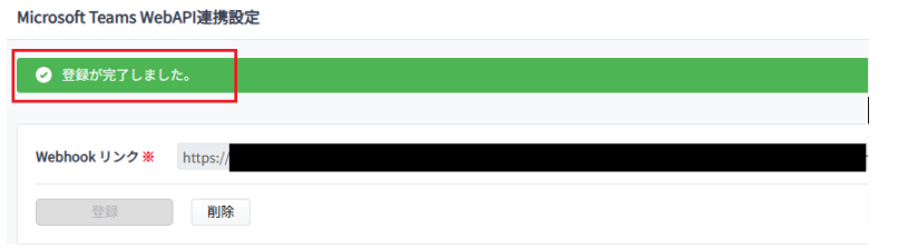 - 画面上部に「登録が完了しました。」というメッセージが表示され、「登録済みの通知先」に連携内容が反映していることを確認します。