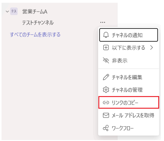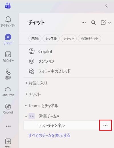 - 「Microsoft Teams」の「チャット」を開き、通知先とするチャネルの「・・・」をクリックします。