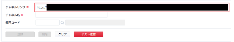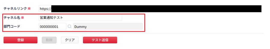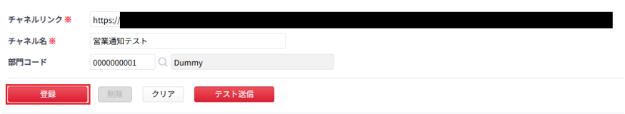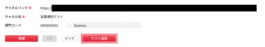 チャネルの登録前に「テスト送信」をクリックすると、連携したチャネルへテスト送信できます。