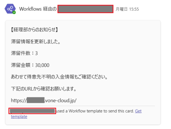 マネーフォワード クラウド債権管理から「Microsoft Teams」にメッセージを送信すると、通知者は「Workflows 経由の●●」と表⽰されます。