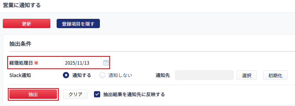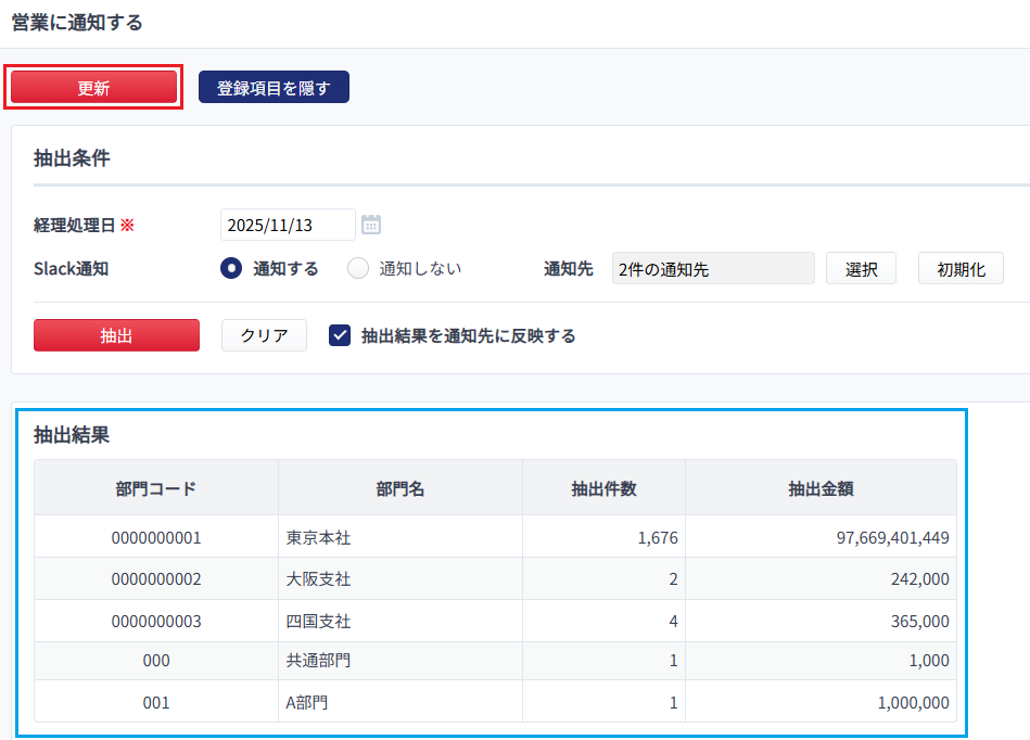 抽出結果を通知先に反映する:チェックをオンにして抽出した場合、通知先には抽出されたデータの部門に紐づいたチャンネルが自動的に反映されます。