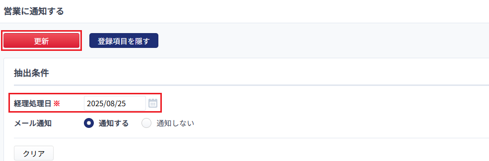 営業の「次回入金予定日」を参考に、入金予定日の更新欄の「次回入金予定日」を入力して「更新」ボタンをクリックします。