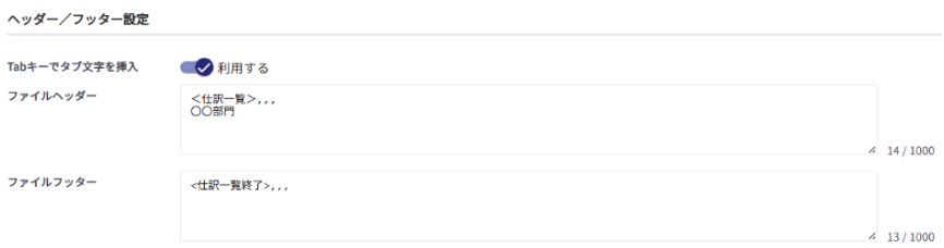 ファイルヘッダー:設定した内容が、出力されるファイルのヘッダーに追加されます。